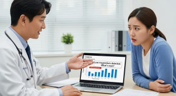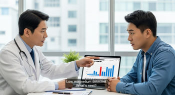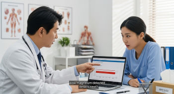 가장 기본은 혈액검사입니다. 하지만 혈중 마그네슘 수치는 전체 체내 농도의 1%밖에 안 되기 때문에, 다른 요소도 함께 봐야 해요.