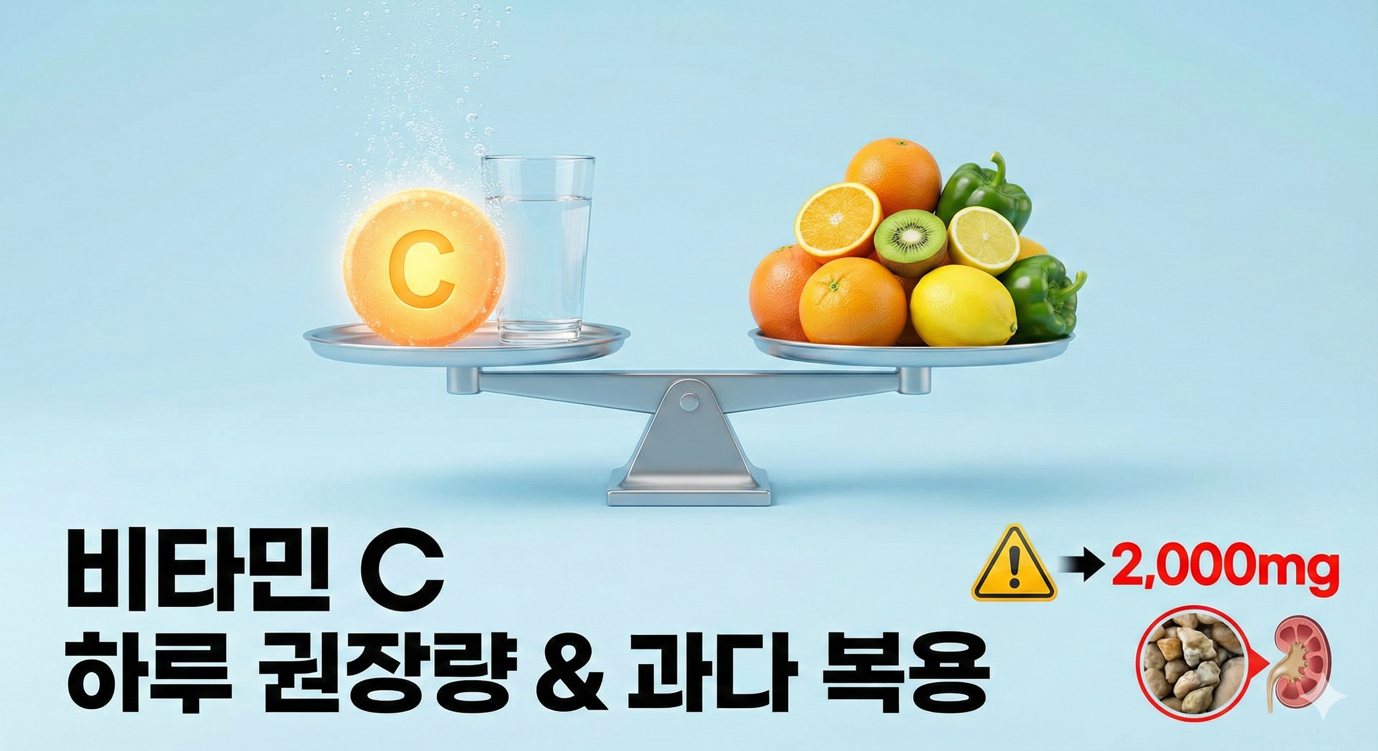 - 상한선: 하루 2,000mg을 넘기면 설사, 신장결석 등 부작용 위험이 급증합니다.