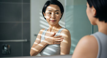 샤워 중 거울 앞에서 유방을 관찰하고, 원을 그리듯 손끝으로 부드럽게 눌러보세요.